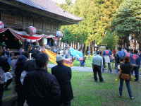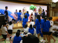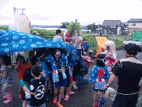 | その後はいよいよ前夜祭のちょうちん行列! 出発していきなり土砂降りに見舞われましたが負けずに進んだところ好転♪ 子供たちも大勢加わりにぎやかな行列となりました。 ちょうちん行列に参加した子供たちには金魚すくいのサービスです。 |