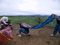 (2011/6/24) 天神祭り初日 前夜祭![]() いよいよ天神祭りが始まりました。 初日のお天気は暴風大雨時々晴れ・・・ まずは早朝5時に集まり幟立て。 強い南風の中でしたが怪我に注意しながら みんなで協力して無事立てる事が出来ました。 ※ 幟の位置は南「佐平」の北「覚十郎」です。 ![]() 幟を立て終わったらお次はちょうちん行列で使うお神輿の準備。 激しい動きにも耐えられるようにロープで補強し 神輿の四方にさかきの枝を取り付けます。 それが済んだら御宮を掃除して一服。 つまみは喜昇堂の菓子パンと佐渡牛乳が決まりです w 夕方、再び集まり知る人ぞ知る青年会名物!?北方沖での一番。 人気のない田んぼのど真ん中にある小さな天神様の前で黒・白、一番ずつ舞を奉納します。 途中、雨にも負けず門付けを行っていた「北方子供鬼太鼓」と合流して競演も行いました。 |