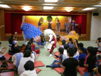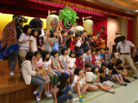 (2011/6/9) 続!修学旅行の鬼太鼓![]() またまた修学旅行先に出向いての鬼太鼓披露。 今回は2校のダブルヘッダーです。 まず1校目、最初は緊張気味だった子供達も 獅子さん登場で一気に和やかな雰囲気に w 鬼を応援する子供たちもいれば 獅子を応援する子供たちもいて興味深いです。 ![]() 舞いが終わるとみんなの健やかな成長と頭が良くなる? ことを願い獅子が子供たちの頭を咬んで回ります。 鬼面を被ってみたり太鼓を叩いてみたりと 鬼太鼓体験の後はみんな揃って記念撮影。 で、会場を移して本日2校目。 ![]() やたらと元気な女子生徒が乱入!? 手提灯を手に鬼に絡んでます w まわりのみんなも一緒になって掛け声を 掛けてくれたりと賑やかでした。 ![]() 終了後の鬼太鼓体験も終始賑やか。 太鼓を叩いてみたり獅子に入ってみたりと 色々な事に挑戦してもらいましたが これだけ喜んでもらえると嬉しいですね。 両小学校のみなさん、どうもありがとうございました。 またいつかお会い出来る事を楽しみにしています。 |