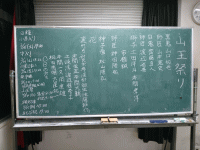 | (2019/3/16) 山王祭稽古 小屋入り 4月14日の山王祭に向けて、稽古がいよいよ始まりました。 まずは軽く一番舞ってから会員揃って一杯やりますが その前に会長から山王祭での配役が発表されます。 新会員加入の嬉しい報告も! 黒板に書かれた自分の名前を見てそれぞれが責任感と決意を持って これから約一か月間の厳しい稽古に備えます。 |