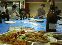 (04/06/02) 天神祭小屋入り![]() 山王祭りから約一ヶ月・・・ あっという間に天神祭の小屋入りです。 まだ寒かった山王祭の頃からは一転、 これからは暑さとの戦いとなります (+_+) ![]() さて、まずは慣わし通り両鬼が舞います。 その後、太鼓を下ろして宴会に突入! 天神祭りの大成功と稽古期間中に 怪我がない事を祈念して乾杯します。 ちなみに、つまみは赤獅子さんが作ってる? へんじんもっこの手造りソーセージ! お酒がどんどんすすみます (^^ゞ |