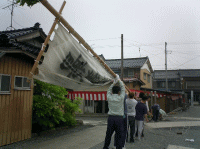 (04/06/26) 天神祭りの後片付け![]() 一夜空けたらお天気は回復。 しかし、会員達の体は未回復のまま・・・ 疲れきった体に鞭打って後片付けです。 ![]() ← のぼりの下に落ちていたずぶ濡れのお猿さん 本来はのぼりにぶら下がってたはずなのですが・・・ 昨日の凄かった雨の名残を感じさせてくれます。 ![]() まず最初はのぼり下ろしから。 強い風に翻弄されながらも3方に伸ばしたロープを バランスよく引っ張り真っ直ぐに倒していきます。 ちなみに、収納場所は近くの屋根裏! その後はお神輿の片付けと、公民館の掃除・・・ やる事が次から次へといっぱいです (+_+) |